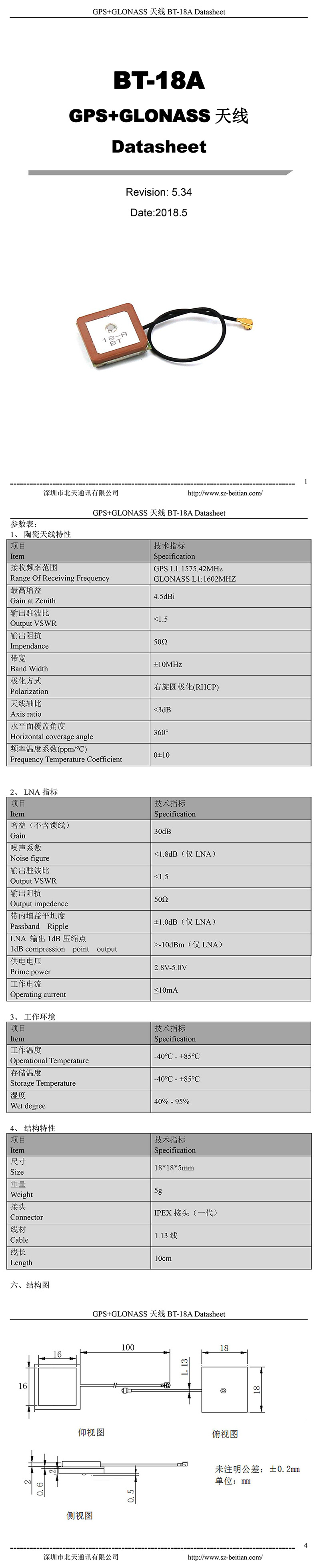 30db IPEX GPS GLONASS双模 有源内置天线18*18*5 BT-18A