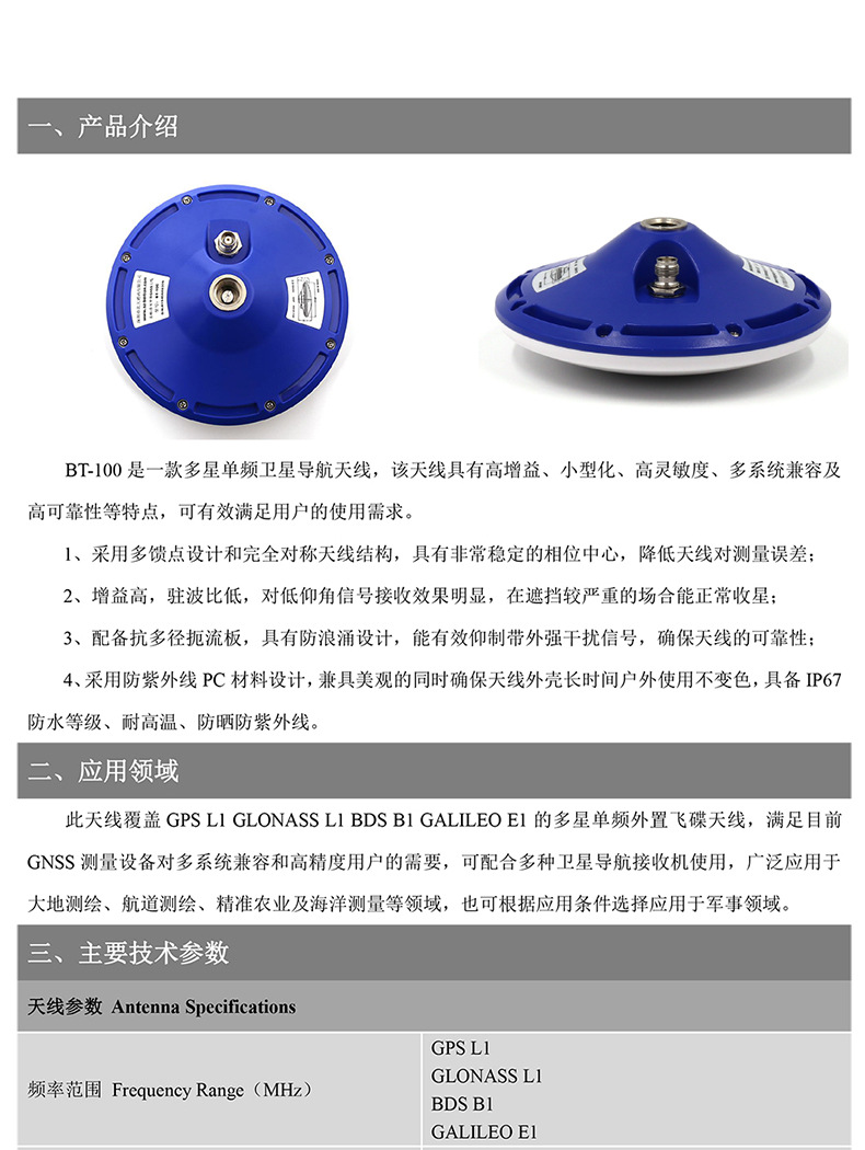 GNSS高精度RTK多形单频高增益挖掘推土机GPS定位蘑菇头天线BT-100