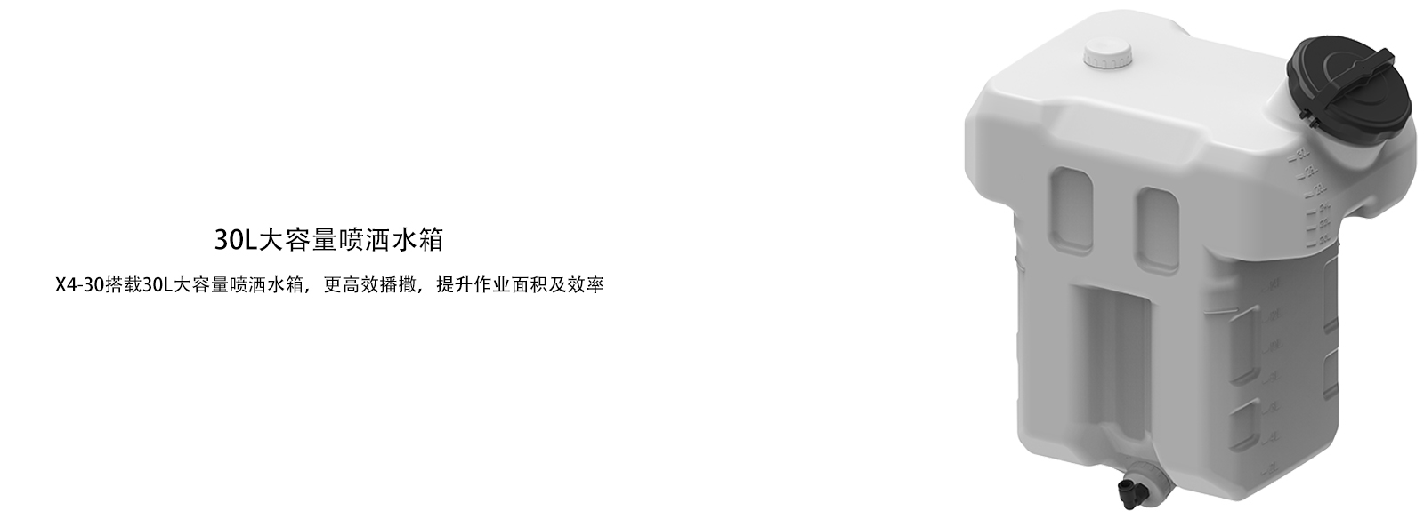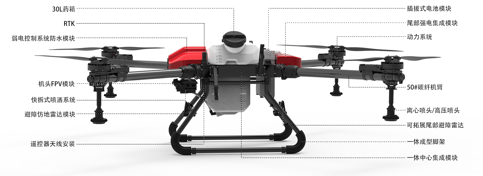 30L(30公斤)载重播撒,可插拔电池、药箱、喷洒系统。集成模块化,