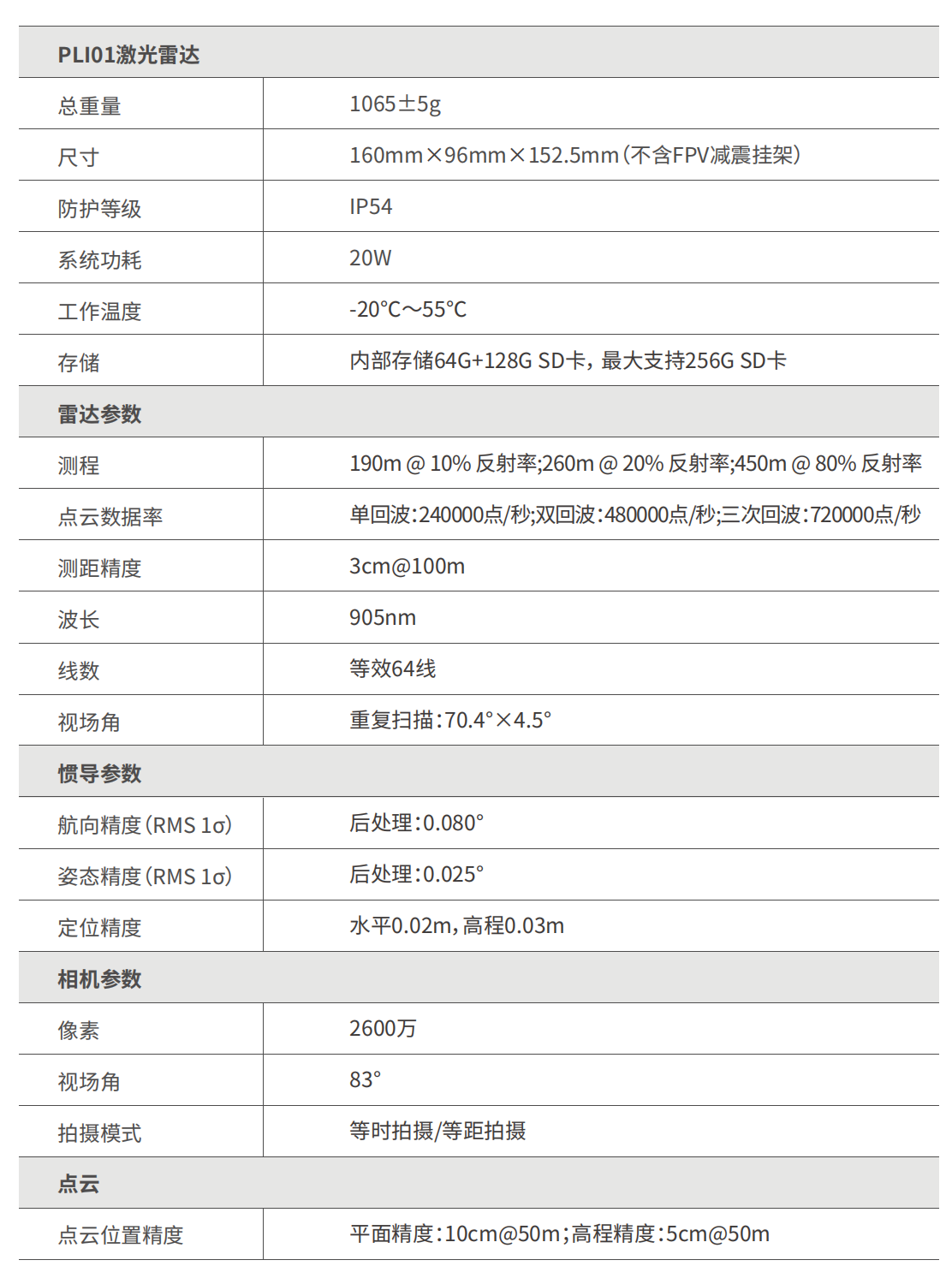 PLI01激光雷达为一款针对多旋翼平台开发的轻量级专业设备,集轻小型激光雷达系统、惯性导航系统及控制系统于一身,能高效采集高精度点云数据及丰富的影像信息 ,广泛应用于测绘、电力、林业、农业、地质灾害、矿山安全等作业领域三维空间信息的获取。