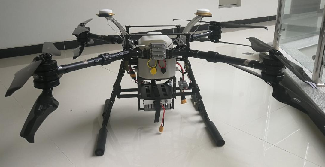 飞行平台采用电力驱动的四轴八桨的多旋翼构型。机身采用高强度碳纤维材料,机臂可折叠,固定式起落架。无人机系统主要由机架、飞控系统、动力系统和机载系留电源系统组成。