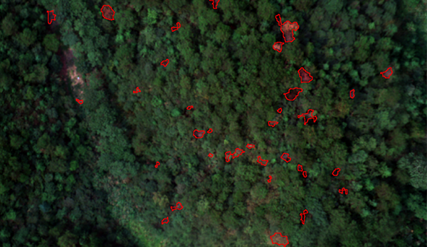 综合利用光谱、纹理信息实现土壤、枯草等环境背景高效抑制和变色立木的高精度识别,精准提取变色立木的位置、空间分布和冠层面积等信息,为疫木治理提供数据支持。