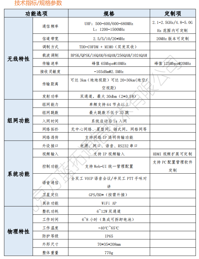 该单兵便携电台采用 COFDM 技术和移动 Ad hoc 网络技术,不依赖任何基础通信设施,可 临时、动态、快速地构建一个无线 IP MESH 网络,该网络具有自组织、自恢复、高抗毁的能 力,支撑数据、话音、视频等多媒体业务多跳传输。可应用于智慧城市、无线图传、野外作 业、矿井作业、临时会议、环境监测、公安消防、反恐特勤、抢险救灾、单兵组网、车辆组 网、无人机等场合。