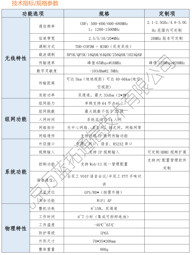 该单兵便携电台采用 COFDM 技术和移动 Ad hoc 网络技术,不依赖任何基础通信设,可临时、动态、快速地构建一个无线 IP MESH 网络,该网络具有自组织、自恢复、高抗毁能力,支撑数据、话音、视频等多媒体业务多跳传输。可应用于智慧城市、无线图传、野外作业、矿井作业、临时会议、环境监测、公安消防、反恐特勤、抢险救灾、单兵组网、车辆组网、无人机等场合。