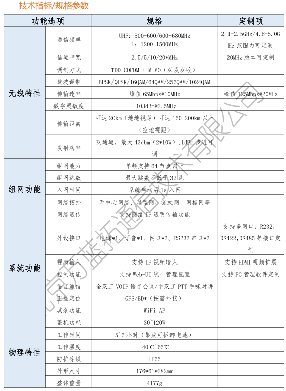 该背负基站型电台采用 COFDM 技术和移动 Ad hoc 网络技术,不依赖任何基础通信设施,可临时、动态、快速地构建一个无线 IP MESH 网络,该网络具有自组织、自恢复、高抗毁的能力,支撑数据、话音、视频等多媒体业务多跳传输。可应用于智慧城市、无线图传、野外作业、矿井作业、临时会议、环境监测、公安消防、反恐特勤、抢险救灾、单兵组网、车辆组网、无人机等场合。该电台可以通过自身的电池直接给摄像头等外设提供直流 24-48V 供电