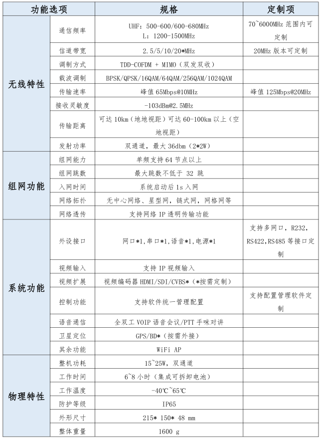 该单兵便携电台采用 COFDM 技术和移动 Ad hoc 网络技术,不依赖任何基础通信设施,可临时、动态、快速地构建一个无线 IP MESH 网络,该网络具有自组织、自恢复、高抗毁的能力,支撑数据、话音、视频等多媒体业务多跳传输。可应用于智慧城市、无线图传、野外作业、矿井作业、临时会议、环境监测、公安消防、反恐特勤、抢险救灾、单兵组网、车辆组网、无人机等场合。该电台可以通过自身的电池直接给摄像头等外设提供直流 12V 供电。