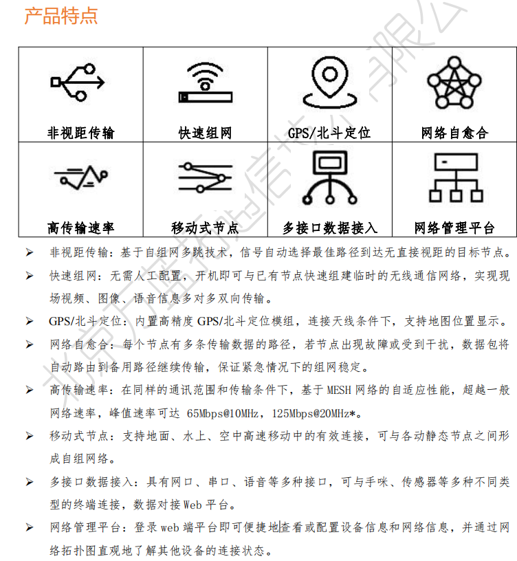 该便携机载台采用 COFDM 技术和移动 Ad hoc 网络技术,不依赖任何基础通信设施,可临时、动态、快速地构建一个无线 IP MESH 网络,该网络具有自组织、自恢复、高抗毁的能力,支撑数据、话音、视频等多媒体业务多跳传输。可应用于智慧城市、无线图传、野外作业、矿井作业、临时会议、环境监测、公安消防、反恐特勤、抢险救灾、单兵组网、车辆组网、无人机等场合。