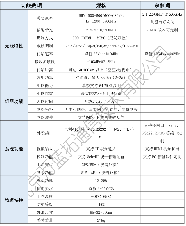 该便携机载台采用 COFDM 技术和移动 Ad hoc 网络技术,不依赖任何基础通信设施,可临时、动态、快速地构建一个无线 IP MESH 网络,该网络具有自组织、自恢复、高抗毁的能力,支撑数据、话音、视频等多媒体业务多跳传输。可应用于智慧城市、无线图传、野外作业、矿井作业、临时会议、环境监测、公安消防、反恐特勤、抢险救灾、单兵组网、车辆组网、无人机等场合。