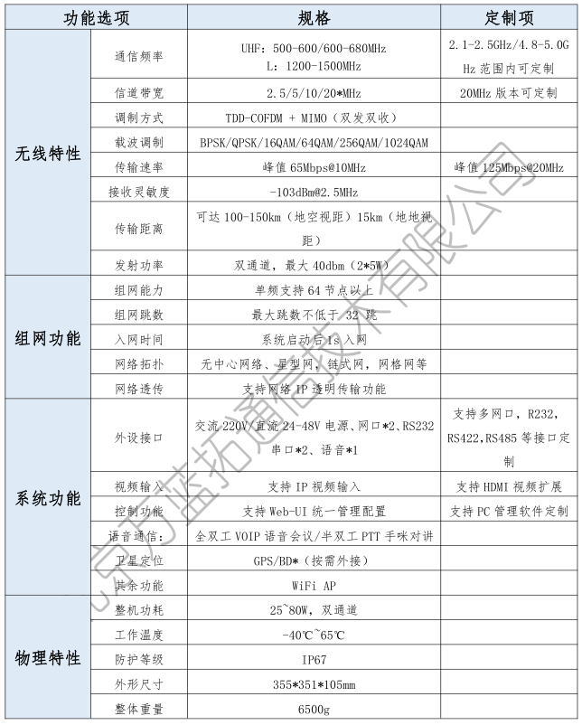 该室外固定基站型电台采用 COFDM 技术和移动 Ad hoc 网络技术,不依赖任何基础通信设施,可临时、动态、快速地构建一个无线 IP MESH 网络,该网络具有自组织、自恢复、高抗毁的能力,支撑数据、话音、视频等多媒体业务多跳传输。可应用于智慧城市、无线图传、野外作业、矿井作业、临时会议、环境监测、公安消防、反恐特勤、抢险救灾、单兵组网、车辆组网、无人机等场合