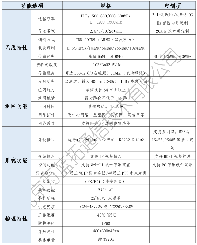 该车载机架式电台采用 COFDM 技术和移动 Ad hoc 网络技术,不依赖任何基础通信设施,可临时、动态、快速地构建一个无线 IP MESH 网络,该网络具有自组织、自恢复、高抗毁的能力,支撑数据、话音、视频等多媒体业务多跳传输。可应用于智慧城市、无线图传、野外作业、矿井作业、临时会议、环境监测、公安消防、反恐特勤、抢险救灾、单兵组网、车辆组网、无人机等场合