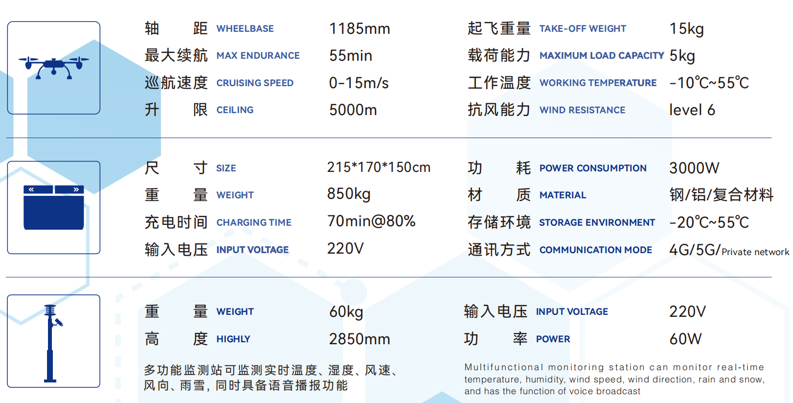SU-30Pro 智能无人机场由智能巡检无人机及智能无人机停机舱组成,系统具有远程操控、自主充电、自主起 降、集群化自主作业等行业优势,为用户提供高效、便捷的应用方式,可广泛应用于环境监测、电力巡检、管道巡 检、森林防火、应急侦测等行业。