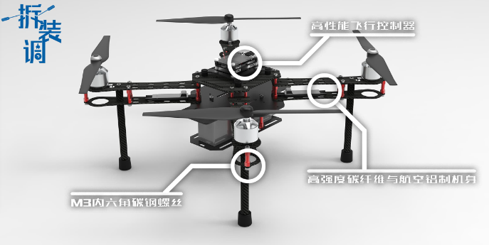 1、采用全碳纤维上下板和航空铝材质,四旋翼结构设计,用于学生室内反复拆装练习、零部件调试、故障检测与维修等;全机身采用 M3 内六角碳钢螺丝,增加反复拆装次数,不易损坏;