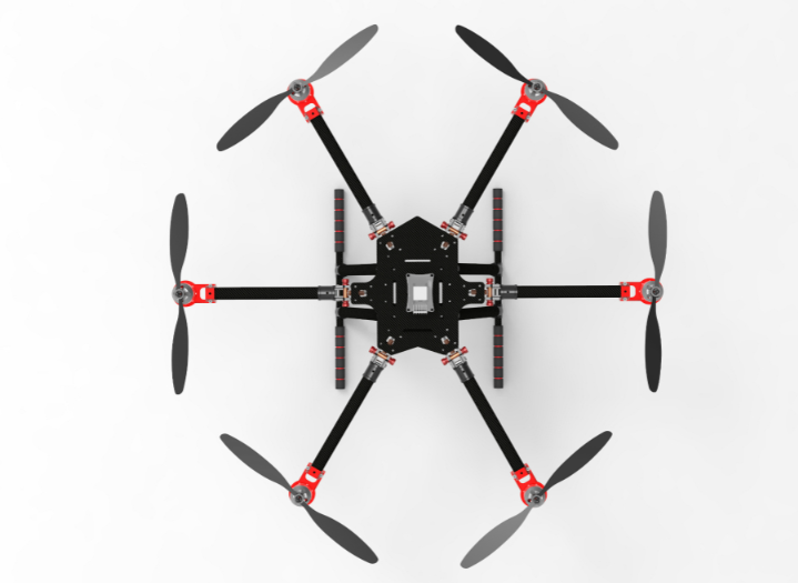 1、机架:机身采用六旋翼 X 型碳纤维结构,对角轴距600mm,机身尺寸600mm*600mm*400mm,机臂采用可折叠设计,上下板采用哑黑镀 金 PCB 设计,下板集成分电板和电池供电功能;
