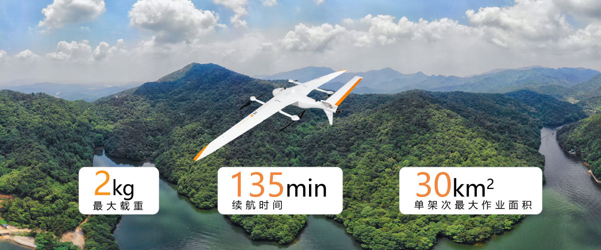 P35固定翼无人机搭载1kg载荷情况下最大续航时间长达135min,挂载正射相机单架次最大作业面积30km2,体现出其优越的气动设计和动力配置。