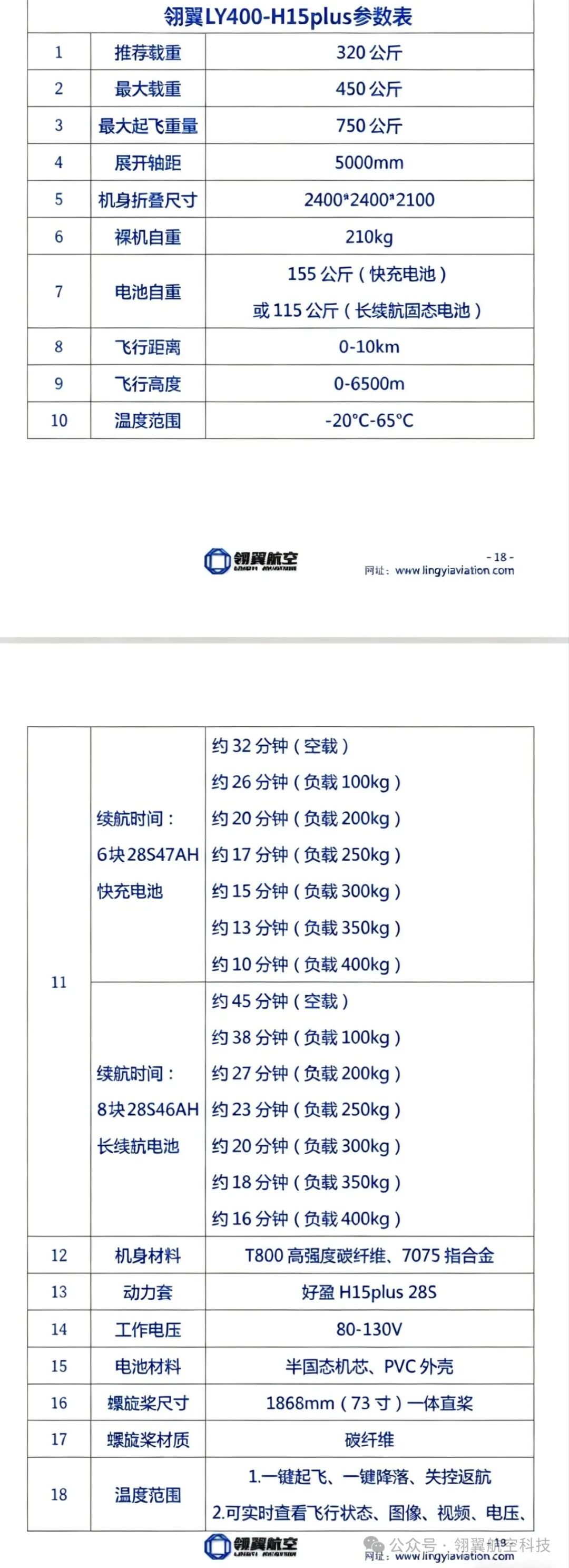 翎翼航空LY400-H15plus型320-450公斤载重无人机(好盈H15plus动力)
