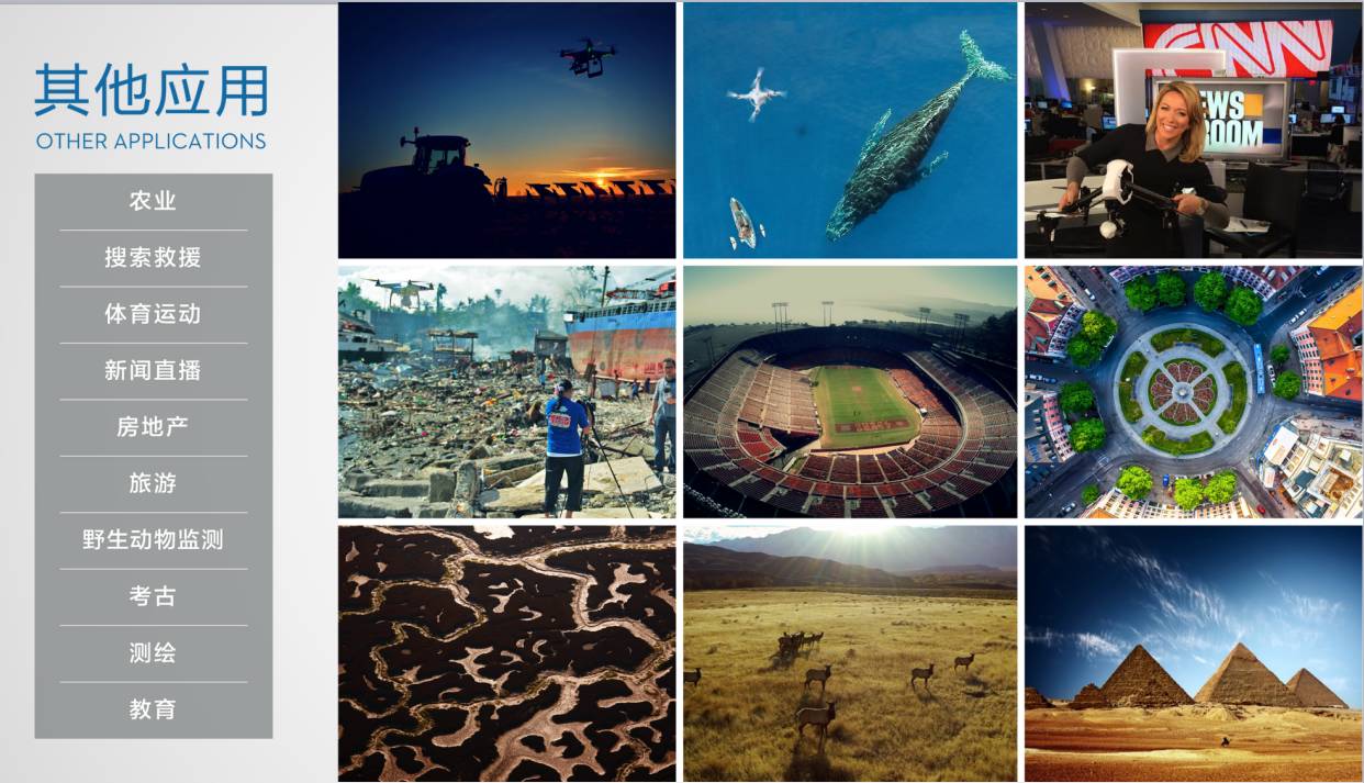 大疆的飞行影像系统已不仅仅用于航拍、影视领域,各行各业都能看到它的身影:地震火灾救援、新闻直播、旅游业、房地产、考古业、测绘、能源、农业、野生动物保护等等。软件开发工具包DJI SDK更是让全球专业人士可以根据自身需要来操控大疆精灵系列产品,让每个人都能轻松实现壮举,创意变成现实。