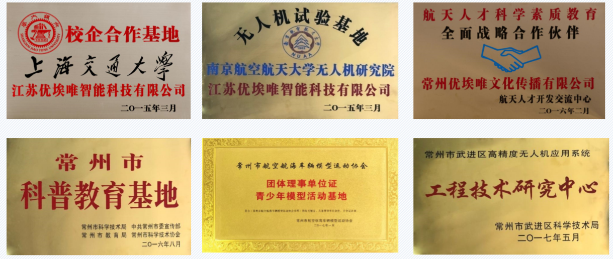 2015年度“龙城英才计划”引进单位,常州市航空航海车辆模型运动协会副会长单位。已先后通过ISO9001: 2015质量管理体系和ISO14001:2015环境管理体系认证。并被指定为南京航空航天大学、上海交通大学在我公司 设有无人机工作站、河海大学硕士生工作站、常州市科普教育基地及武进区高精度无人机应用系统工程技术研究 中心。与常州工学院共建市级无人机智能感知技术研究与应用重点实验室,并与国内十多所高校建立了产学研协 作关系,且是航天国际人才交流中心合作方。并成为2018年江苏省重点研发计划(产业前瞻与共性关键技术) “基于仿生立体视觉的输电线路无人机智能巡检系统”项目的承担单位。