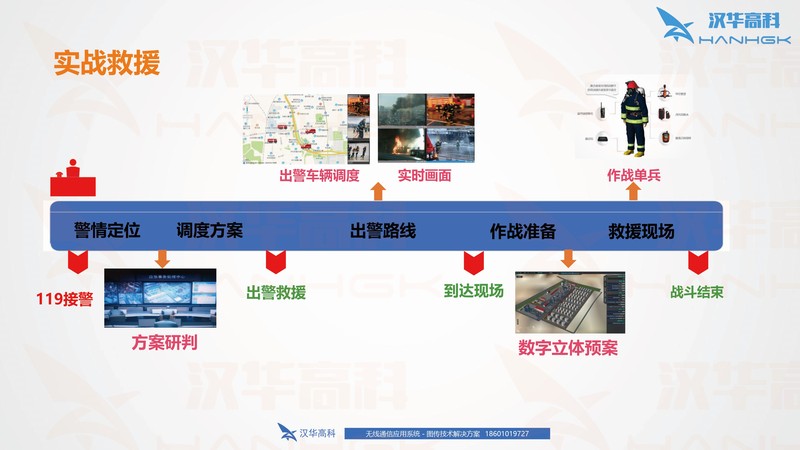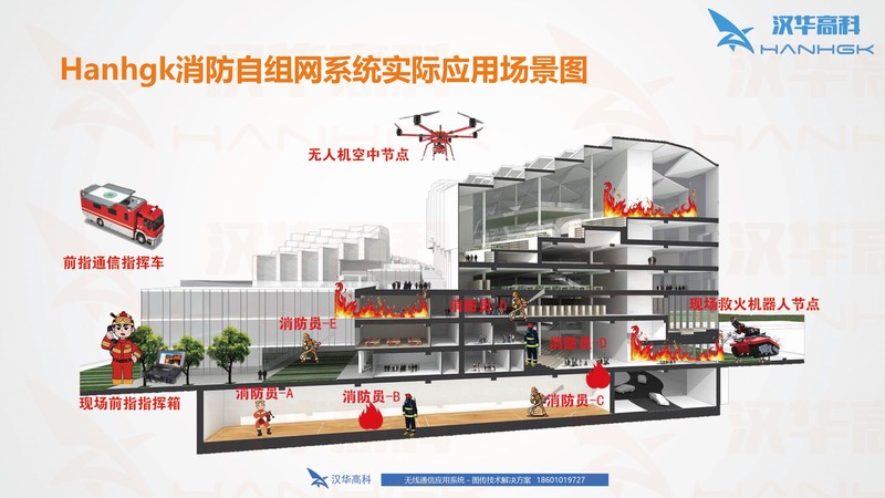 在消防救援紧急事件和灾害处理时,汉华高科-hanhgk便携式数字双频无线自组网设备配合现场应急自组网通信系统可以全面满足后方基指、前指、单兵分队语音和数据的通信网络需求。自组网设备能够在地铁及地下室等地方实现跨楼层语音覆盖。当地下室环境复杂,可通过多级多跳的自组网节点提供链路,为重点区域进行语音覆盖。消防通信指挥车上可配置应急综合指挥平台,并与现场应急自组网任一节点相连, 通过有线、公网、卫星等多种可用链路与后方指挥中心对接,将现场应急网络与后方指挥中心连接,从而实现前后方-体的指挥调度。