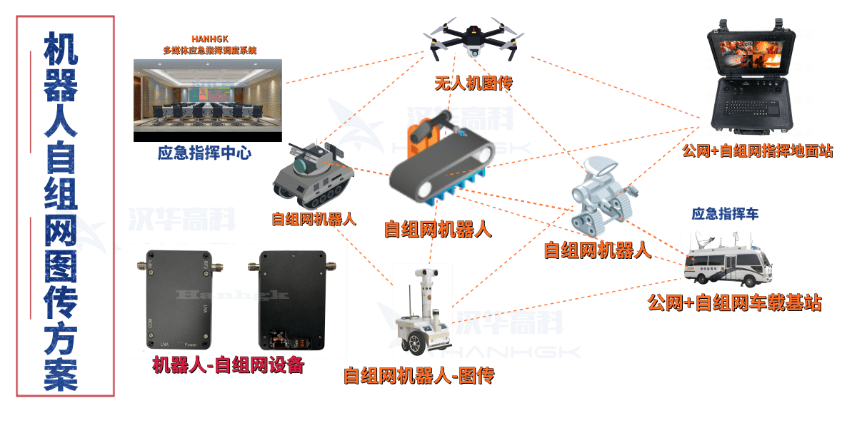Hanhgk-H.265+动态压缩编码技术、基于OFDM技术和MESH多跳自组网技术、1.2Mbps传输25帧/s1080高清画质图像;
