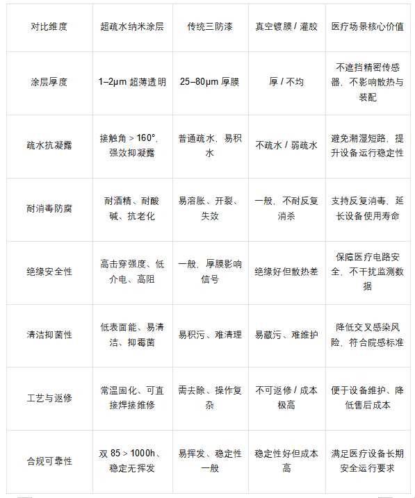 5. 传统方案短板明显:传统三防漆耐消毒差、易黄变;镀膜成本高、返修难;灌胶不利于散热与维修。